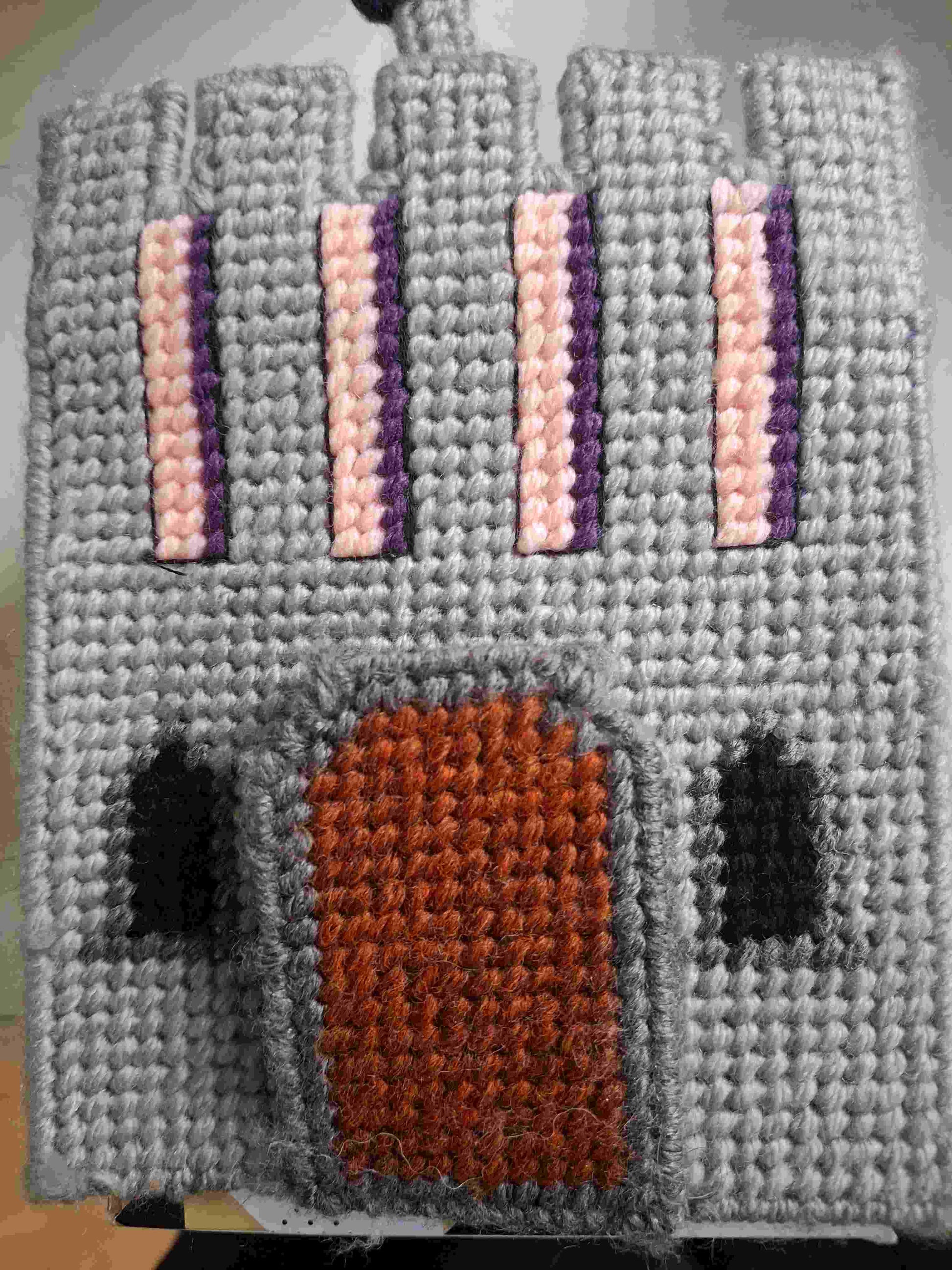 This lovely castle is for you tissue square boxes which fits over the top of your tissue box when opened it comes with a smart pen storage box that could sit at the side of your castle or in a different place where ever you choose made from plastic canvas and covered in yarn for its design